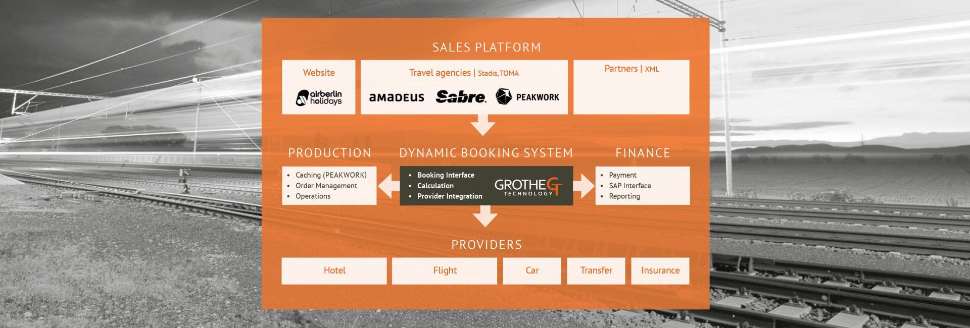 Nach einer ausführlichen Analyse der individuellen Anforderungen der airberlin holidays hat Grothe Technology das Buchungssystem mit einer dynamischen Paketierungsplattform sowie mit Schnittstellen zu zahlreichen Flug- und Hotelprovidern und einer Backoffice-Anbindung konzipiert. Das von uns entwickelte System war flexibel erweiterbar, so dass im Laufe der Zeit immer weitere touristische Leistungsträger angeschlossen werden konnten – z. B. Versicherungen und Mietwagen.